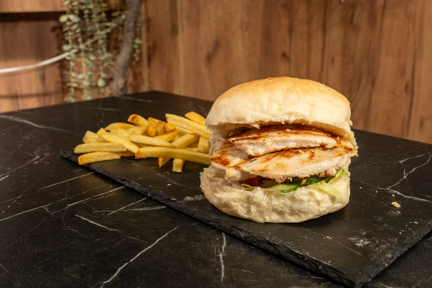 х2 пилешки стека, кашкавал, салата, бургер сос, помфрит