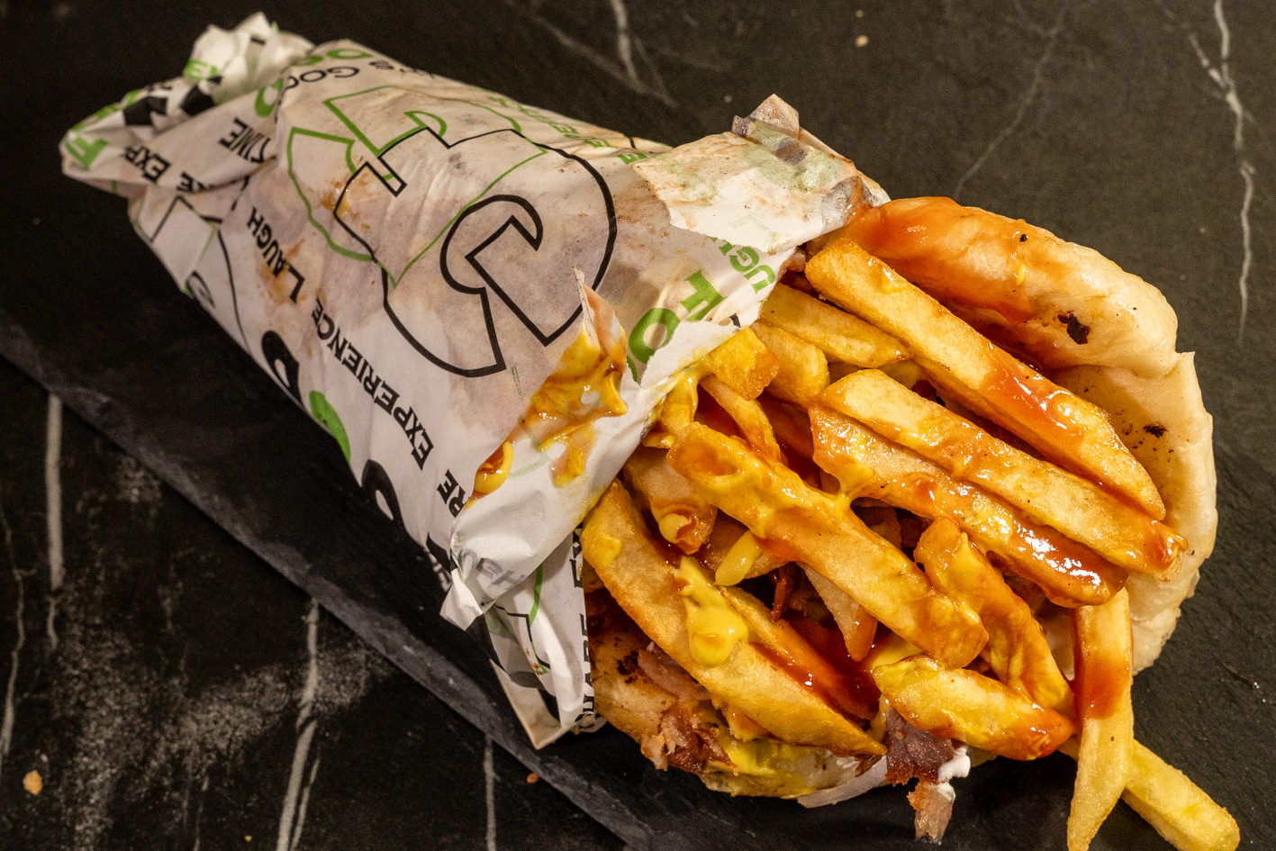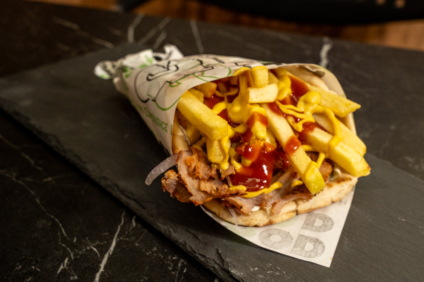 свинско месо, помфрит, домат, цаѕики сос, кромид, лепиња