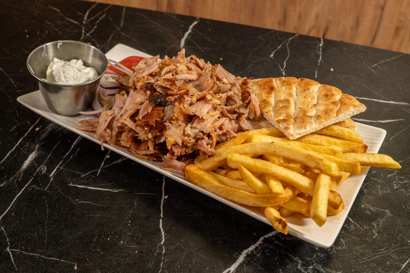 свинско месо, помфрит, домат, цаѕики сос, кромид